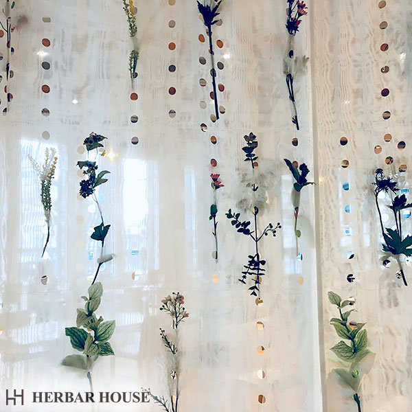 空間を仕切るカーテンですが、開いた穴に造花がさしてあります。