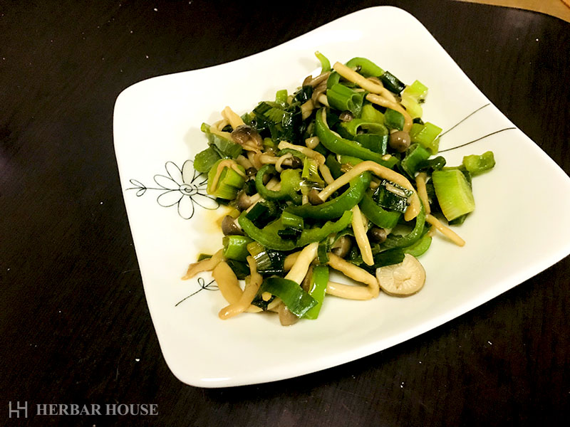ネギの青い部分と、しめじ、ピーマンの炒め物です。