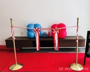レッドカーペットを敷いたり、先程の風船や看板を飾ったりします。