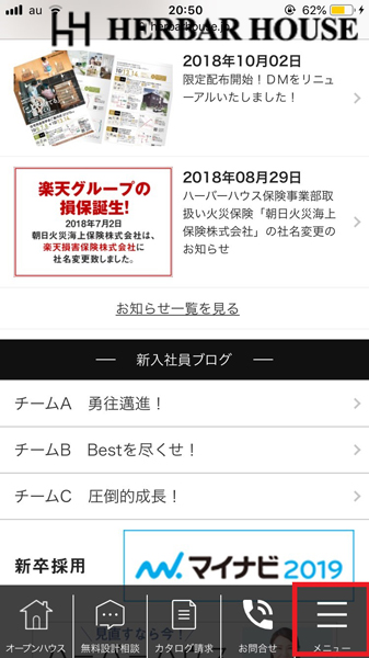 スマートフォン画面左下にあるメニューボタンを押して頂くと、