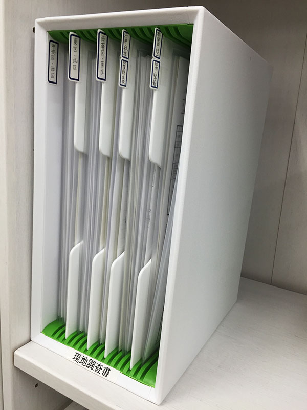 これは現地調査書という書類をしまっておく棚になります。