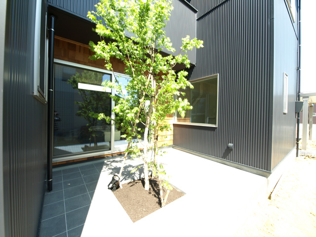 ブラックをベースに木パネルを合わせたモダンな外観♪