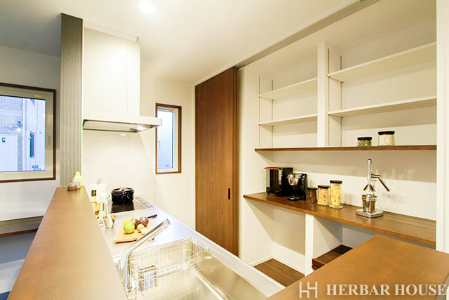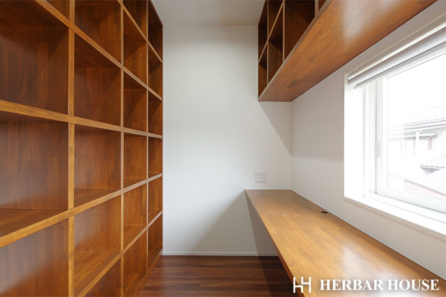 キッチン手前のカウンターや、子供室の造り付けデスク・本棚、洗面台など、
