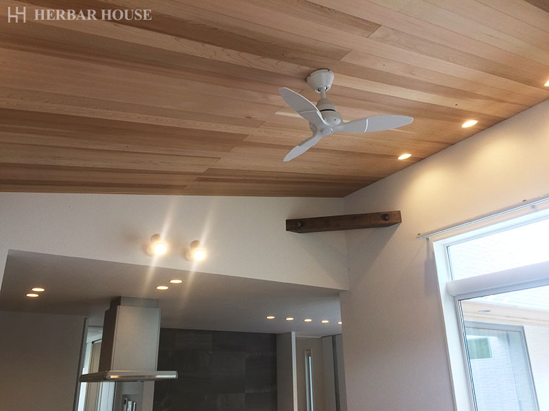 火打ち梁あらわしがポイントの、部屋を広々見せる勾配天井や・・