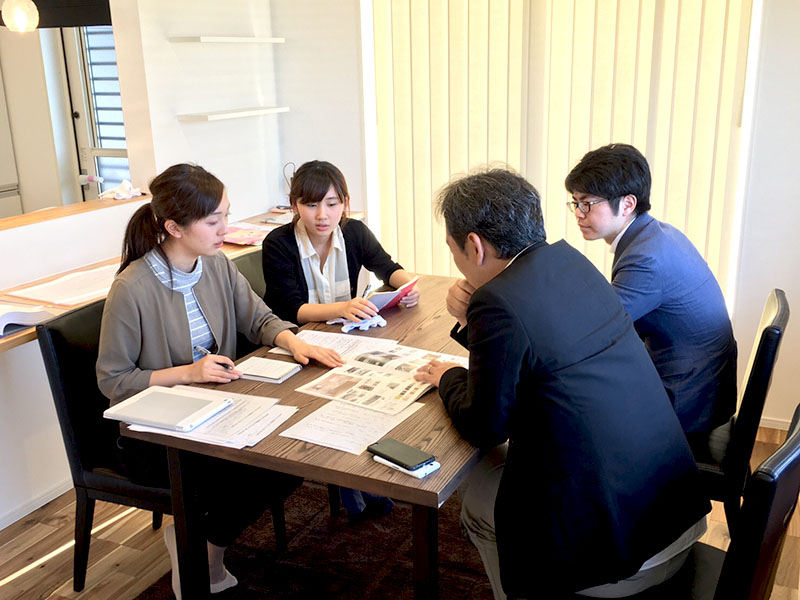 新卒3人が設計デザイン室田邊室長より住宅についての講義を受けている写真です。