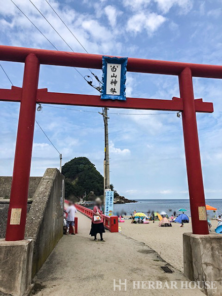 こちらの鳥居をくぐり、赤い橋の先に見えるのが白山島です。
