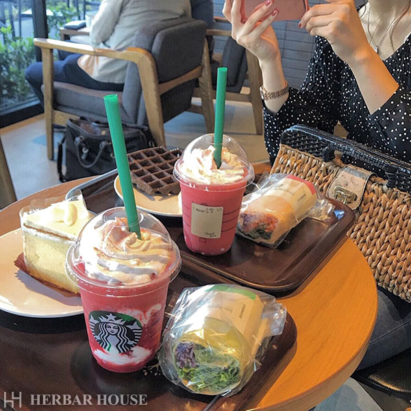 ストロベリーのフラペチーノとサラダラップとワッフル(クリーム付き)を頼みました(笑)