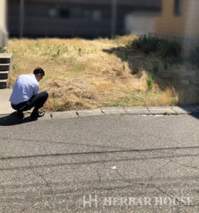 間口(土地の入り口の幅)を計測されているところです。