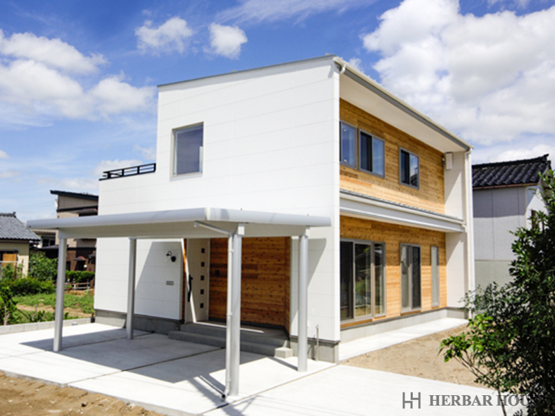 白を基調とした外壁に、無垢材(純粋な木材)が