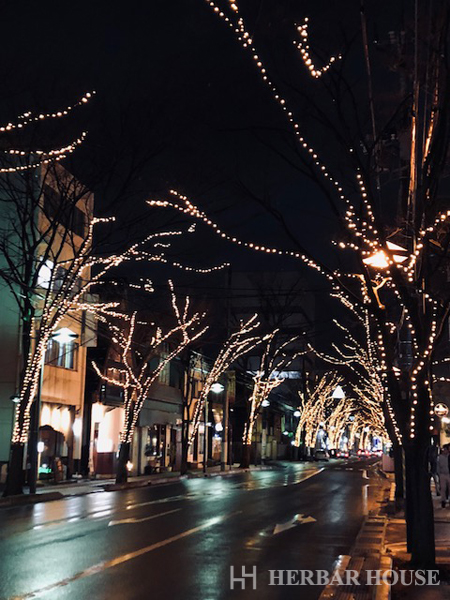 けやき並木がオレンジ色にライトアップされており