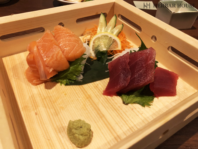 最初はお刺身が来ました。サーモンとマグロ!