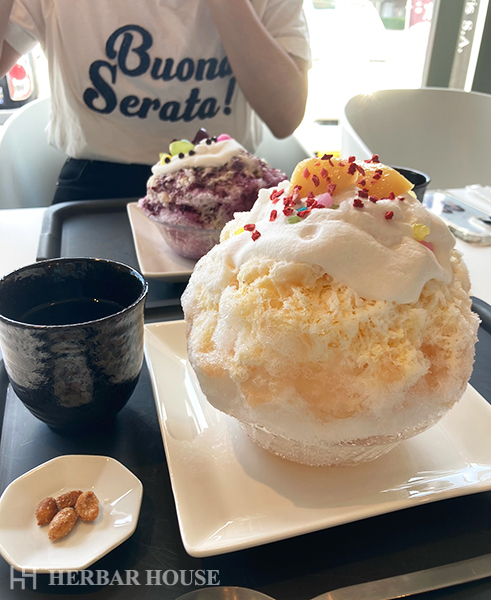 私は桃のかき氷を、友人はブドウのかき氷をいただきました。