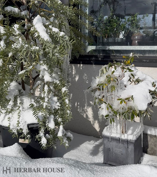 外置きのオリーブにはつららが伸びていて、